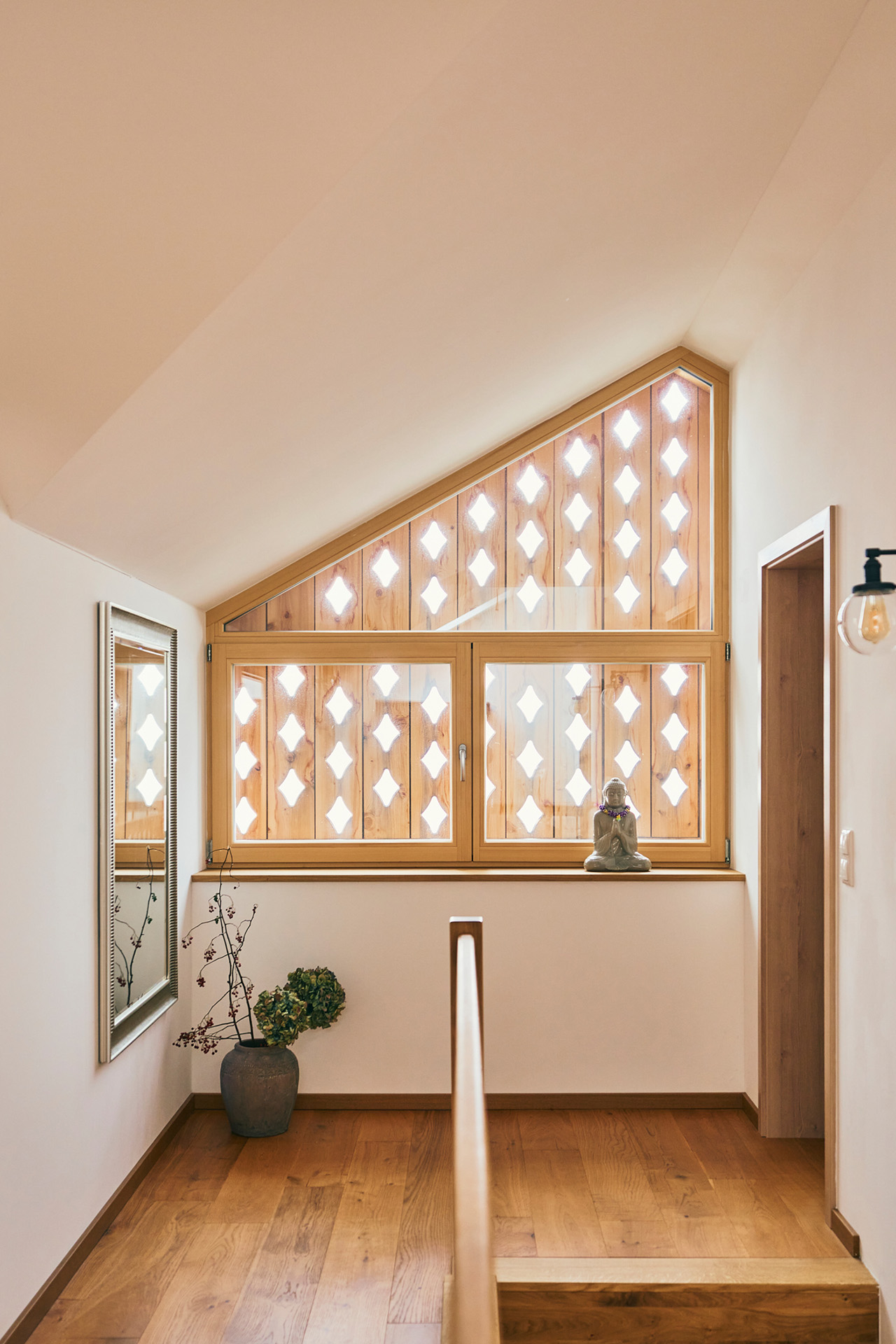 Das verwendete Holz stammt zu 100 % aus dem eigenen Wald und wurde im familieneigenen Sägewerk verarbeitet. Auch die Massivholzbalkendecken entstanden in Eigenleistung – ein Bauprojekt mit regionalem Materialkreislauf und starker handwerklicher Prägung.