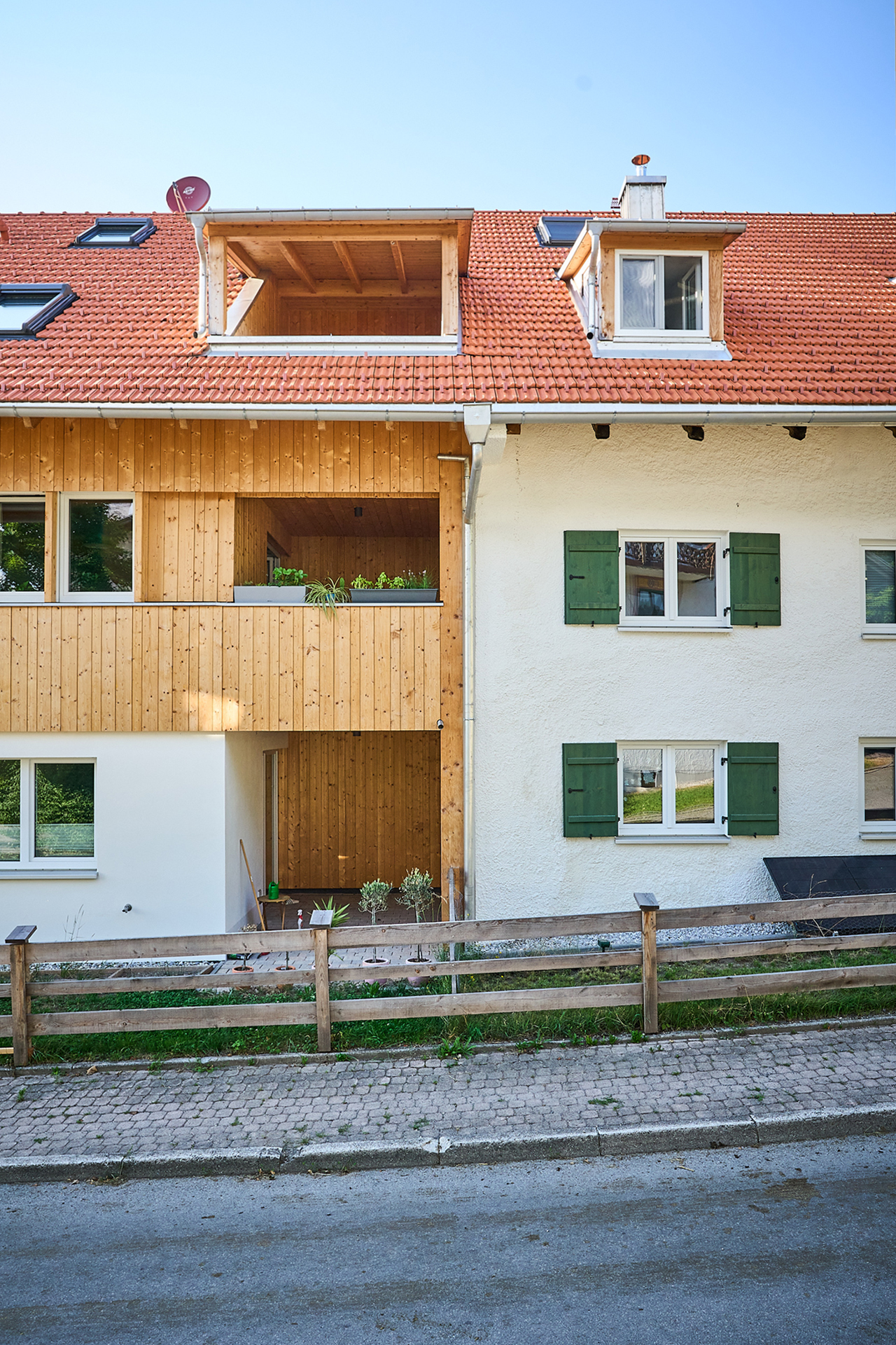 Nach einer Bauwerksanalyse entpuppte sich der verputze Altbau als historischer Blockbau, eine Erhaltung und Sanierung des Wohnteils war für damit gegeben und half uns dabei eine Begründung für die Erhaltung des Gebäudestandortes und des Gebäudevolumens zu entwickeln. Die Remise konnten wir in einen Freisitz, eine Garage und einen Fahrradschuppen umwandeln. Der Stall und die Tenne wurden durch einen Neubau in der gleichen Kubatur wie der Altbau ersetzt, an der Stelle der alten Tenneneinfahrt befindet sich nun der Zugang zu einer Wohneinheit.
