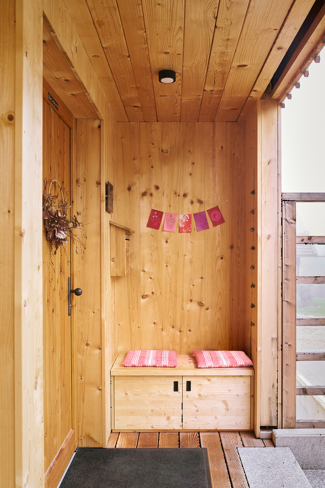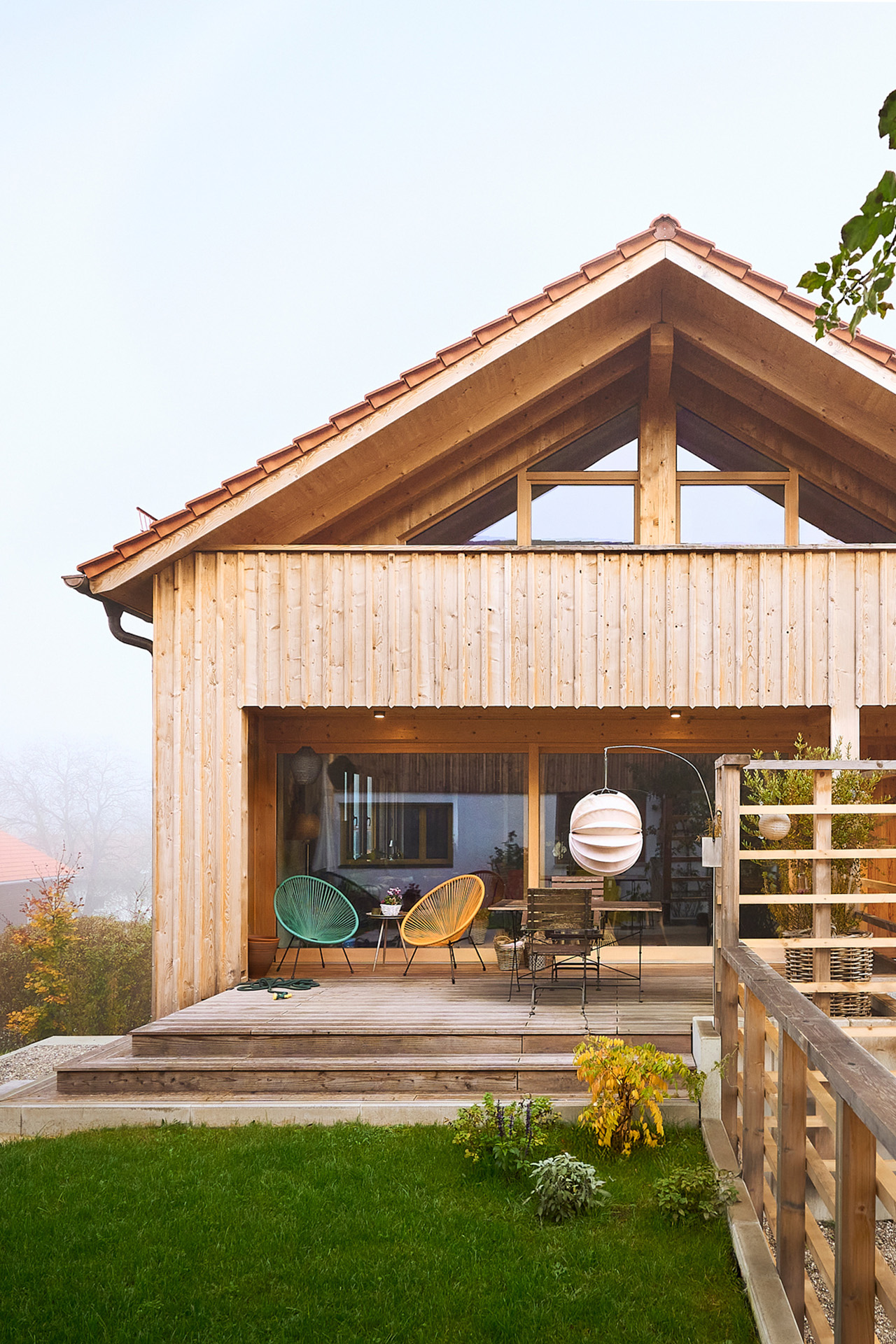 Das verwendete Holz stammt zu 100 % aus dem eigenen Wald und wurde im familieneigenen Sägewerk verarbeitet. Auch die Massivholzbalkendecken entstanden in Eigenleistung – ein Bauprojekt mit regionalem Materialkreislauf und starker handwerklicher Prägung.
