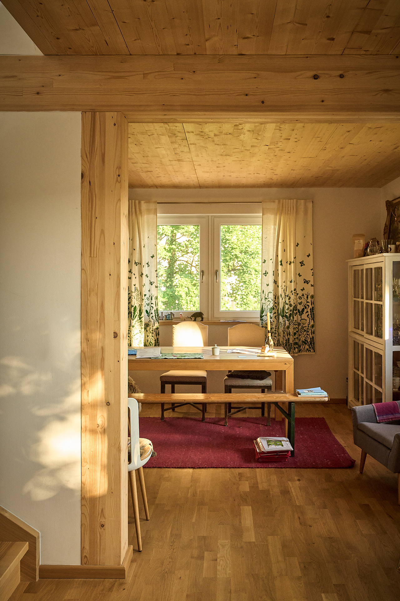 Nach einer Bauwerksanalyse entpuppte sich der verputze Altbau als historischer Blockbau, eine Erhaltung und Sanierung des Wohnteils war für damit gegeben und half uns dabei eine Begründung für die Erhaltung des Gebäudestandortes und des Gebäudevolumens zu entwickeln. Die Remise konnten wir in einen Freisitz, eine Garage und einen Fahrradschuppen umwandeln. Der Stall und die Tenne wurden durch einen Neubau in der gleichen Kubatur wie der Altbau ersetzt, an der Stelle der alten Tenneneinfahrt befindet sich nun der Zugang zu einer Wohneinheit.